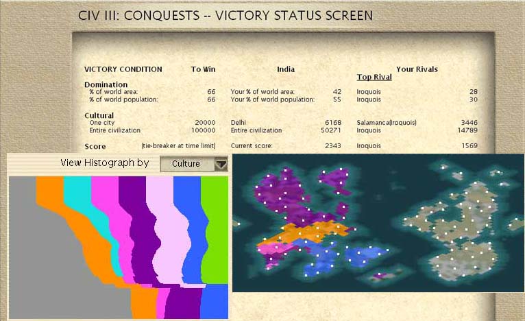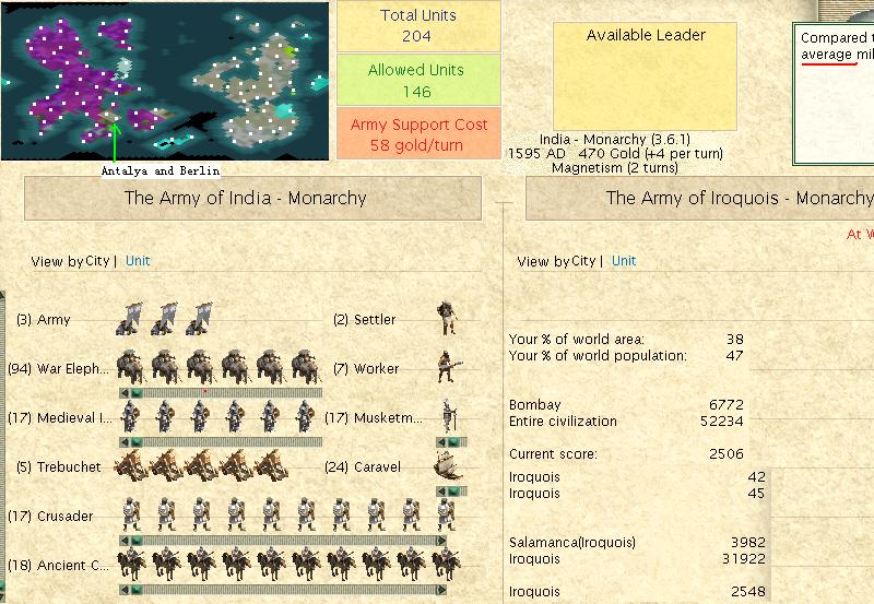 Now, a mere 20 turns after the statistics described above, Indian culture had increased to 31,034, at a rate of 665cpt. Ravi had lost count of the number of buildings that had been rushed, but it averaged 2 per turn, sometimes 3!