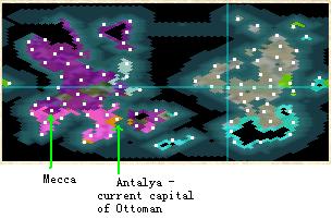 Remember capitals of all four nations on the other continent stayed at the starting points in 1310ad? When we charted our first world map in 1410ad, much had been changed. Ottoman had been driven to former Germany's land, with two cities left. Mecca of Arabia was also fallen. Spain was even smaller, from 4 cities in 1310 to 3 in 1410.