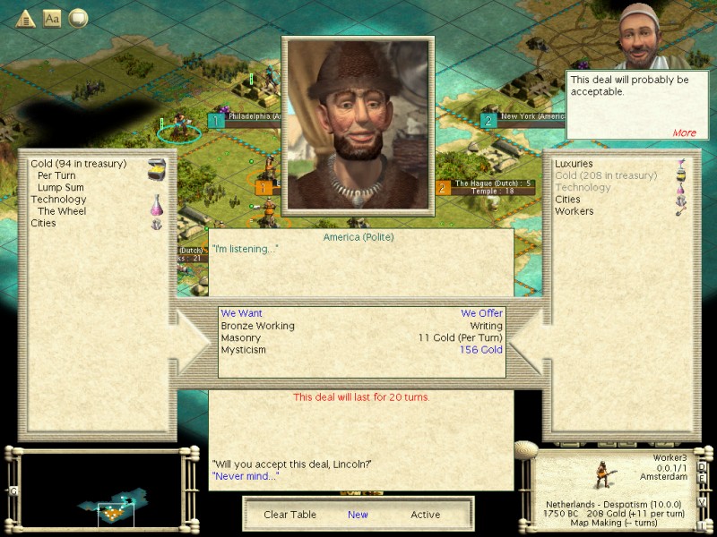 I also chose my opponents, China, America, Japan, Egypt (!) and Arabia. This shows the dramatic changes to both Rel and Ind since Vanilla, as I previous took Egypt as my builder civ and now want them as my builder opponent. Here's my rationale: I don't want Agr (obviously), Com, Sea or Sci in my opponents (and there are few enough that this isn't too limiting. Com/Sea both star with Alph, which is no good, as well being generally good traits (I didn't choose the Dutch for nothing!) Sea is used poorly by the AI, but the more I can keep contacts down, the slower the tech pace, which is why I want no Sci civs either. Mil and Rel are on the verge of useless for a Deity AI, and Ind is not as great as it used to be. Exp. is good because it's a small map, of course, though its one caveat is they start with Pottery, which is the only tech I want to trade for the first 50 turns (well, 40 anyway).