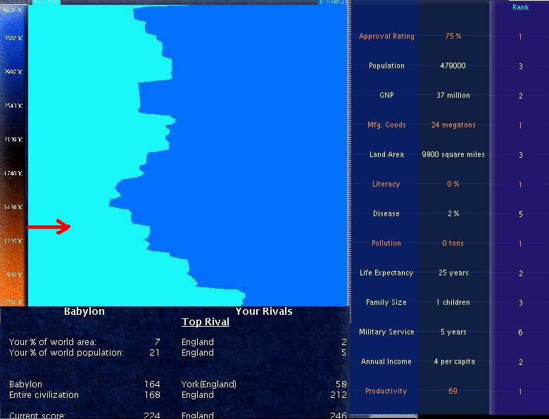 (though we should be ever vigilant). I choose to make peace to gain the free techs, and note that we will prepare to finish England, honorably, at the conclusion of the cease fire 20 turns from now. English contacted, peace made for alpha/myst/wheel and 35. Wheel reveals horses near Ellipi and Nottingham. After the trade, I note that England has math and poly. With the peace, lux can go to 10%. I then chose to research writing now, 50% sci = 14 turn pace and 3gpt (we have 320 in treasury) vs 50 turn pace and 11gpt.