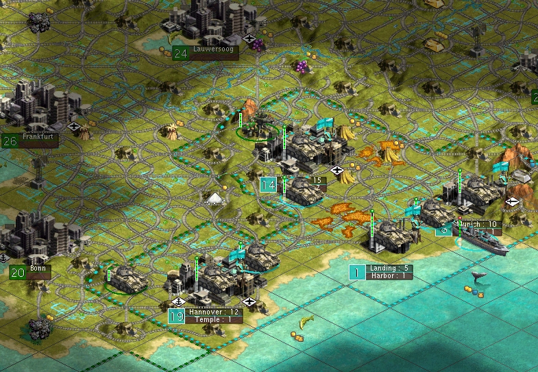 This was ready and in position in 1914AD, and I launched the attack the next turn. The Aluminum Landing is at Munich11 in the pic below.