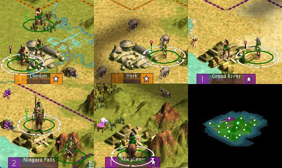 I also disbanded my capitol, moving it to a city built near the Horses, Iron, and Flood plains to the North. This really helped my overall production and commerce. In the Iroquois counterattack (several Warriors), one of my elite Archers generated a GL, which was used to rush the FP in a city NW of London that had just been founded. I made peace again with the Iroquois finally, getting Iron Working in the deal. I upgraded a few Warriors after hooking up the Iron, and again broke the peace treaty. This time I was able to take a size 2 city (Niagra Falls) with a Chariot, because the movement doesn't allow them time to pop rush. A lone swordsman had moved in (the turn before starting the war) and killed the Spearman defender the first turn of the war, and the Chariot killed the Warrior that was left. 2 more Swordsmen took Grand River, leaving the Iroquois with just 2 remaining cities.