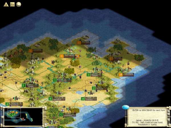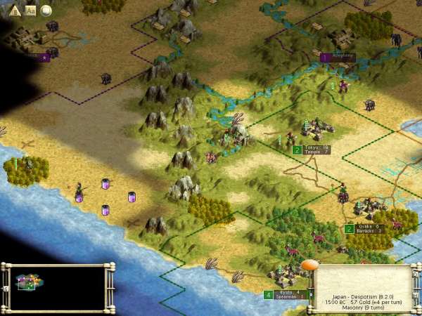 Eventually, I got Chivalry and started building up a force of samurai. A little later, I got Engineering (so rivers wouldn't get in my way) and essentially stopped research for a while to get the gold needed to upgrade my horsemen. When I felt like I had enough forces ready, I struck.
