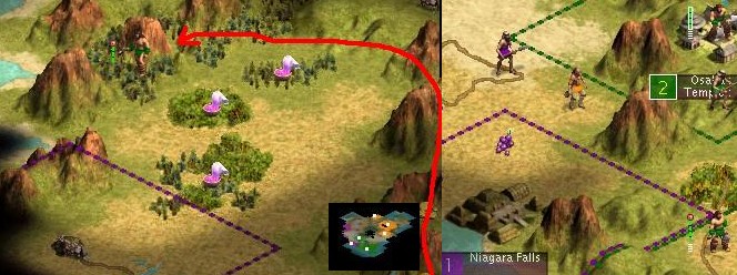 . The victorious archer is fortified for healing. The lone enemy warrior has moved to the border of Osaka. A regular warrior is pulled out of Osaka and placed on the mountain in-between the Iroquois warrior and Osaka.
