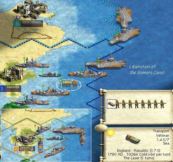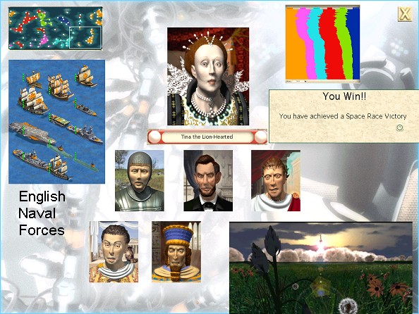 In the mid to late modern age, world war again erupted. Tina managed to remain neutral, and, as the world moved to communist governments, English republicanism triumphed, letting Tina’s subject enjoy the launch to Alpha Centauri in 1900 AD. Tina ended the game having fought in one prolonged world war, and having never generated a great leader. The English capitol remained in London, although small portions of the northeast territories had become productive with the construction of marketplaces, courthouses and police stations. Despite much naval warfare, very little ground combat occurred – Tina’s boyfriend Hippie Sam indicated that the advance of civilization didn’t require warfare and he was correct.