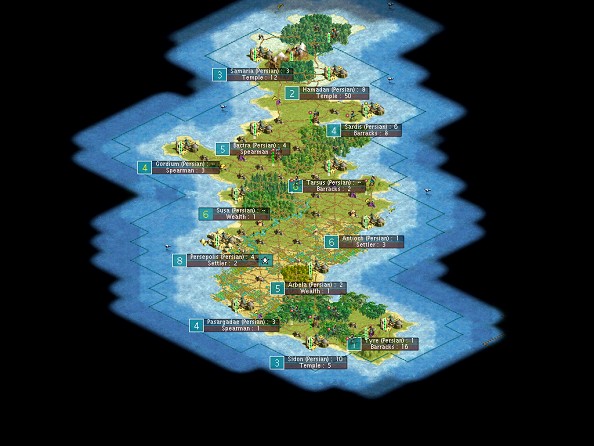 In 350 BC, Xerxes’ scientists and politicians had perfected their knowledge of the most efficient and appropriate means of governing a sprawling nation as a Monarchy, and following a brief period of anarchy (4 turns) as the old gave way to the new, Xerxes established the Persian crown. In 270 BC, Susa completed the Hanging Gardens. Having reached his goal of becoming the empire’s sovereign, Xerxes instructed his scientists to research technologies that would allow his cities to grow, prosper, and advance. Particular emphasis was placed on Construction, which would allow aqueducts, and Mapmaking, which would allow increased food harvests from the Persian coastlines.