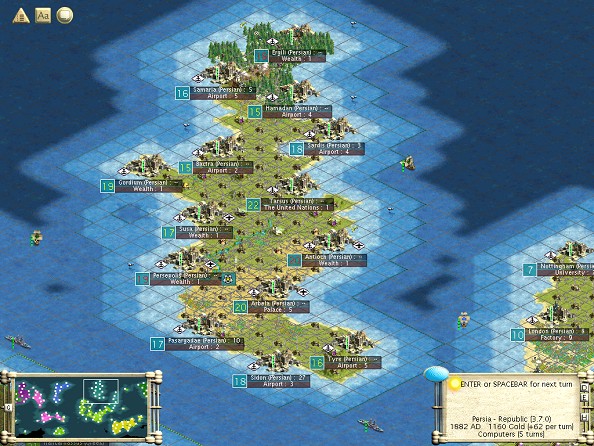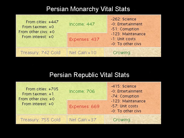 Xerxes was soon faced with his first strategic decision – how best to promote the scientific efforts of his people? Xerxes, again in a dream, had foreseen a form of government called Republic that would allow his cities to prosper through increased trade and commerce – the spoils of such increased commerce could be devoted to research efforts. But this Republican form of government provided the populace with perhaps a bit too much freedom – if the empire could not provide sufficient luxury items, contentedness-inducing city improvements and entertainment (through spending or the hiring of local entertainers), then the Persian Republic could stagnate and fail to live up to its promise. Xerxes also foresaw a form of government called Monarchy under which Xerxes would be crowned king and, though his people would be less free and therefore enjoy no significant commercial advantages, they would be comforted and controlled by the kings troops stationed in each city. Xerxes also hoped to benefit from a magical wonder called the Hanging Gardens which would provide additional contentedness to his people, but about which it was said only a King (or someone how could become a King if he was so inclined) could build it. Xerxes, after much less thought than was probably prudent, elected to seize the crown and declare Persia a Monarchy as soon as possible – regardless of his ultimate decision to move towards Republic or Monarchy, Xerxes knew he needed to through off the yoke of dictatorial despot as soon as possible in order to inspire his people to greater productivity. Persian scientists were ordered to research towards an understanding of Monarchy.