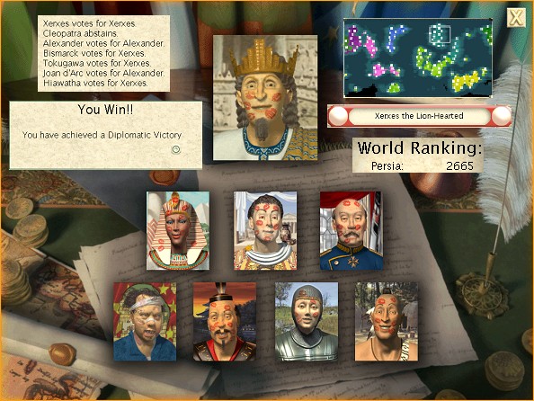 Xerxes had been told in a dream that the Persians would occupy in toto their island home and that contact with a wider world and other civilizations would not occur for millennia, except for the occasional meeting of barbarian folk. Believing in his dream, Xerxes planned for the development of the Persian civilization. Since military threats were virtually non-existent, Xerxes knew he could channel the Persian energies into culture and scientific pursuits; but Xerxes also knew that accomplishing too much too early could drive his civilization into a Golden Age, and Xerxes, given the choice, preferred to preserve that opportunity until later in the game when he was able to contact other civilizations.