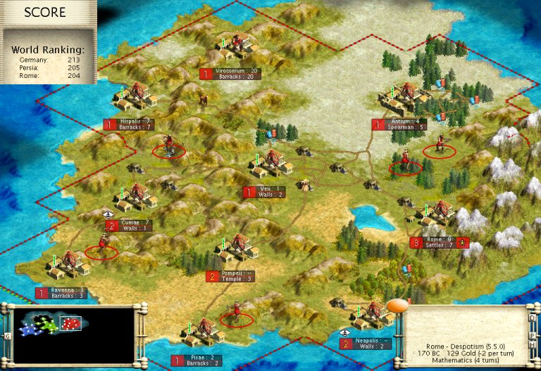 170 BC - Our Empire has grown to 10 cities now, but we have used up all the workable land. Conquest is the only way to advance our purpose now. The slow progress of working our Iron deposits is enraging me. This work should have been completed centuries ago! Someone's going to get such a whipping for this...