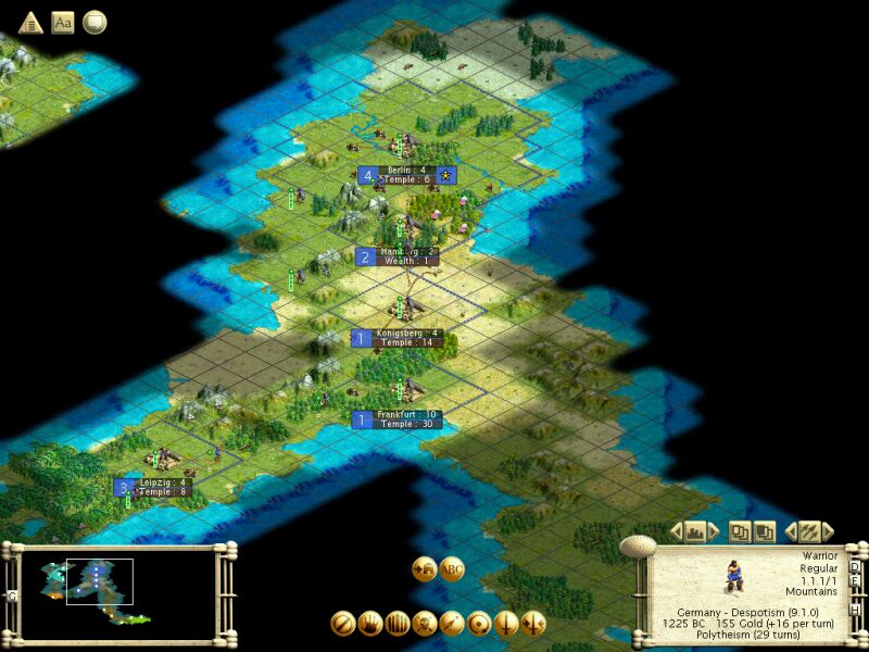 I’m open to discussion for sure, but it seemed best to try for high culture, despite being a nonreligious civ, and to finagle to get the Great Library. Bismark managed to reach those two goals and to place cities out as far as the gem lux mountains to the Southwest and just short of the big bed of furs to the Southeast. You can see these positions on the screenshots posted above.