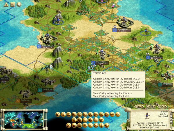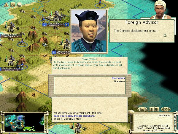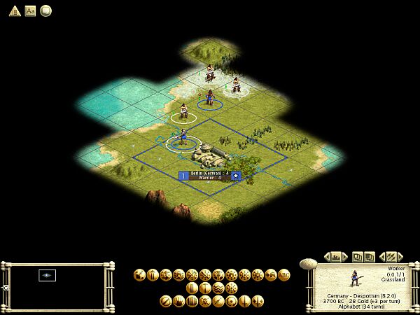 I got quite a scare from Rome when they declared war on me while I was still in major REX mode. They came into my territory with about 3 spearmen and 2-3 archers. Were they ever a pain. I killed all Rome's units but one spear, and did that spearman ever act strange. First it started making its way to my source of Horses. Good move right? I thought so too. But once it got there, it just sat there for a few turns instead of pillaging. Then it made it's way to my furs, only to sit there for a few turns aswell. After that, i made peace with Rome, forcing him to give me 20 gold for peace, even though I didn't have its territory map, had a smaller army than him, and hadn't attacked one of his cities yet.