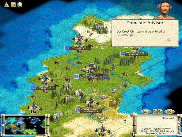 I expanded peacefully as far as the gems to the SW and just north of the furs to the SE. China slipped in a city at the crux of the upside-down-Y; i.e., due south of Berlin, north of both the gems and the furs. Rome (of all people!) archer rushed me, but I saw it coming, and Rome has been OCCing it since the beginning. Like others' games, China and to a lesser degree Persia are big, bad AI civs; Babylon is strong but isolated. I'm just into the Industrial Age, part of an alliance against China consisting of Germany, Persia, Russia, and England.