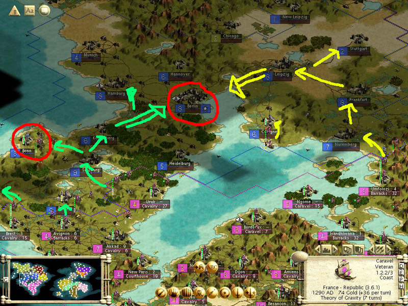 Well I haven't had a chance to play too much but what little I have played hasn't been to good. I'm now at war with almost the whole continent. The only people not at war with me is the Zulu. Dang Monguls. Luckily there's not a lot most of them can do. Japan landed a single swordsman in the mountains NE of my capitol but I'm sending several horsemen to deal with them. I'm sending a small force to put a little pressure on the Germans so that they'll accept peace.
