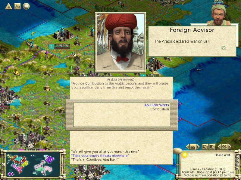 In 1340 AD Abu Bakr demanded the secrets of Industrialization from me – he was refused and he declared war. Once again French diplomacy went into action, but on a smaller scale. I signed alliances with Abu Bakr’s continent-mates the Celts and the Aztecs, but didn’t seek such alliances from my own neighbors. I actually hoped that Babylon might be induced by the Arabs into declaring war against me, just so I could finally “clean up” the continent, but alas, no, it was not to be.