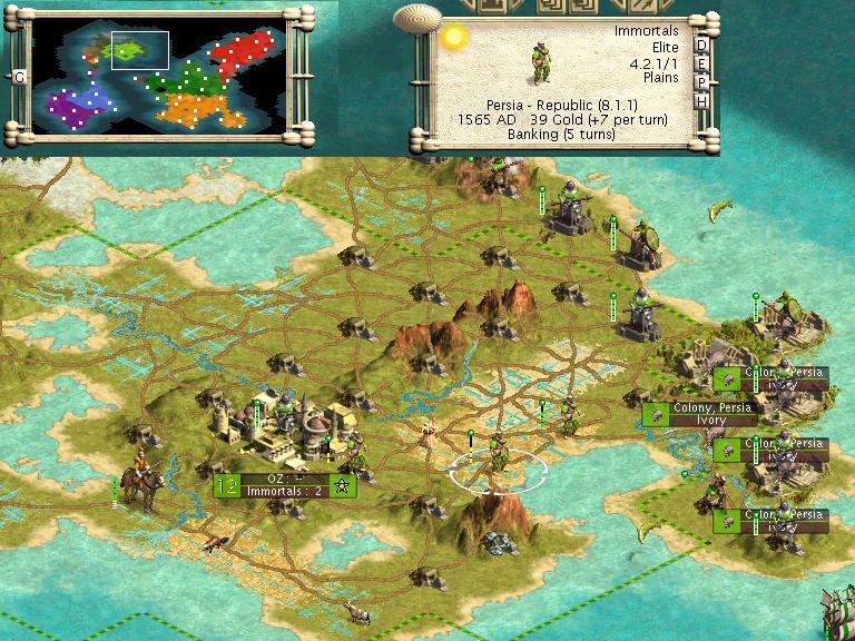 I was much more successful on wonder building this time. My first wonder built was the Colossus, which accidentally triggered a GA for the Spanish people. Unfortunately, they were still governed by a despotic regime so they could not enjoy their GA. It's because their leader, el Rey Kon Questo, diverted all the funds to build nice houses on the beach for himself and his family.