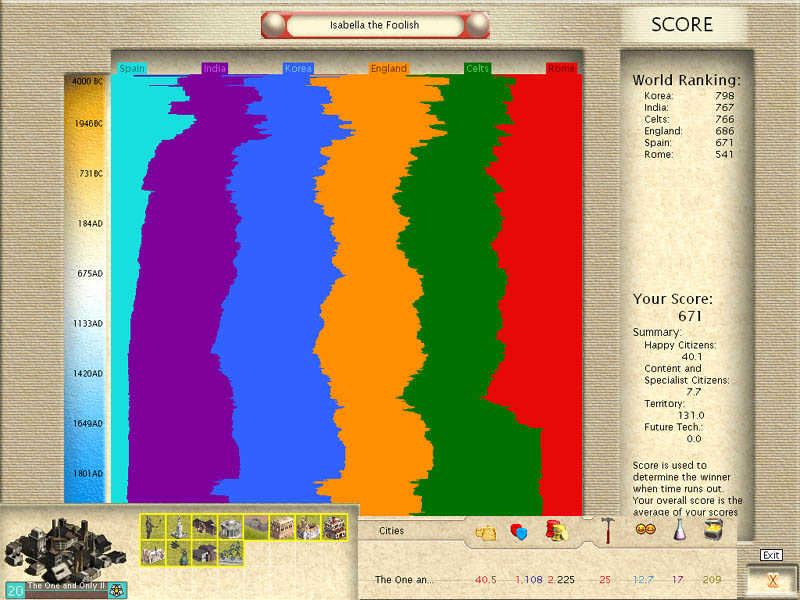 My main goal in this game was to take care of all the AIs and to get them all about the same size to prevent a quick launch by a killer AI (such as England in my first game...) So I traded a lot with the Celts and the Romans in order to stop England to expand freely on the continent. It was fairly successful. The Celts went at war a couple of times with the English and were much more powerful, but their empire was fairly improductive so I managed to retain the upper hand. I got good deals with both the Indians and the Koreans. I must admit I traded a little more with the Indians, as they got overrun in the first game. I think I did a good job as no AI escaped from the pack. This allowed me to be rather competitive throughout the whole game...