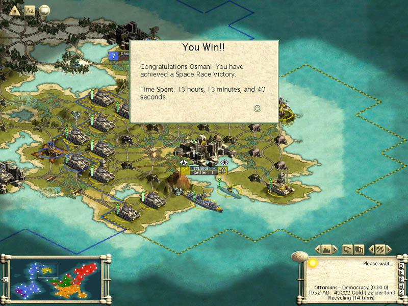 Finally, and most importantly, you really have to attempt to control who goes to war with whom. Ideally you want to pit the civs who will gain little to no ground against in each other. It is sometimes not obvious to gauge if this will be the case, but careful Resource and Gold gifting can "correct" any significant advantage. Wars are extremely costly for the AI, since they produce so many units and switch to Monarchy or Communism almost immediately. To accomplish this sort of diplomacy, I've found that it is actually better not to be too friendly with the AIs, since they will never make demands and therefore will never declare war on you. Let them declare war on you, sign some Alliances, sit back and wait 20 turns and all works out well. Obviously this works best with civs that are very far away, since they can never threaten you (which would be bad, with only one city in your empire). So, in my game, I've never declared waron the Koreans (rather, I've never let them declare war!), since they could wipe me out whenever they wanted to. Luckily other civs declare war on Korea periodically, meaning Korea never gets the chance to pull ahead technologically.