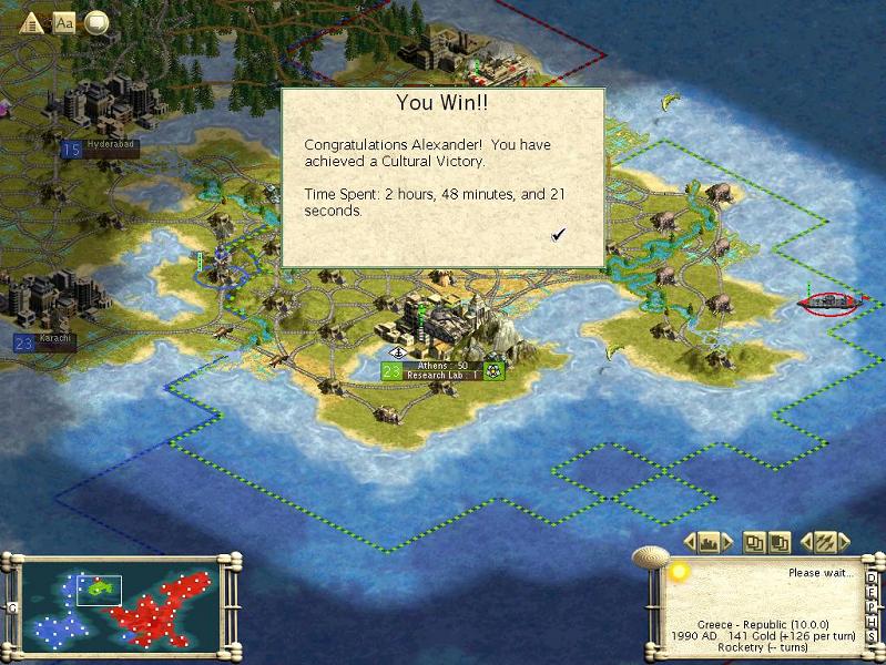 I finally finished AU302 after three tries: two with Greece and one with Babylon. First ended 8 turns before cultural victory after a stack of ~16 tanks attacked my capital. Stupid Romans, I even had an MPP with them and they were "gracious".Oh well. I got behind in tech too early somehow with Babylon, even with the GL. I tried Greece again and finished with a cultural victory in 1990 a.d. I built 8 wonders: The Colossus, the Great Library, Newton's University, Sistine Chapel, Theory of Evolution, Smith's Trading Company, Hoover Dam, and the Hanging Gardens. I settled south of the starting location on the hill for iron works and the colossus. I don't think I did bad for my fourth Monarch game and my third OCC game.