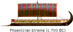 In the 8th century BC, the bireme was created. Descendant from the unireme, it was about 25m (80') long, with a maximum beam of about 10'. The bireme had 2 banks of oars - hence its name. The Phoenician bireme had a single pole mast with a square sail and steering oars to port and starboard, with two banks of oars staggered on either side of the vessel; the upper bank situated above the lower to permit the oars of the upper bank to clear the rowers below. The vessels used for trade in the Mediterranean were of approximately 30 m (100 ft) in length. Larger Tarshish ships with which they ventured out through the Straits of Gibraltar and up to the Scilly Isles were also built. Phoenician war galleys were low at the bow and high at the stern. They possessed a heavy pointed ram at or below the waterline.