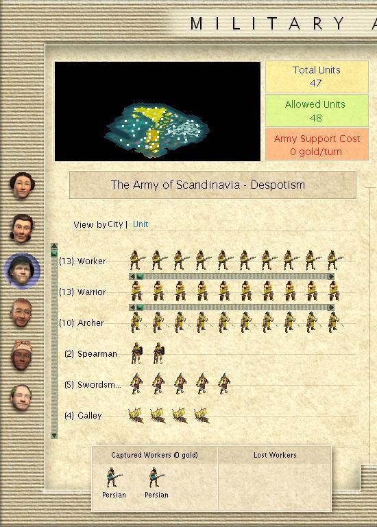 Jonny: I would like to have 2 spears in each city; that way, we have all the military police we can while all of our offensive units can be out on the battlefields