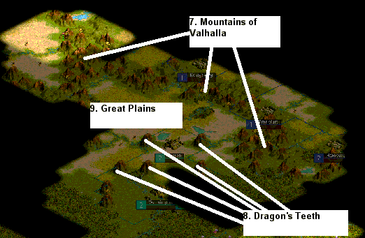 These are the names of different terrain features on the map. 1, 2, 3, 5, 6, and 7 are official; all others are unofficial. Please post suggestion for the unofficial ones in this thread, but not until I finish posting the three maps.