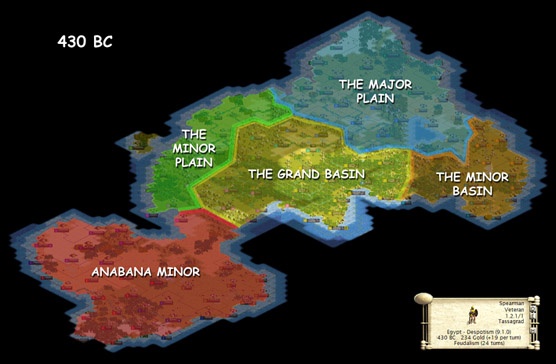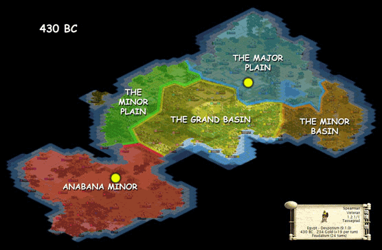 Now, the question is, how shall we gain control, hegemony, over the five major, basic geographical sections: The Grand Basin, The Minor Basin[s], Anabana Minor, the Minor Plains and the Major Plains? Well, let me break down the annalysis into two three sections for each part, an annalysis of the sections by A. civ starting potentials and how they have behaved, B. by the viability of direct vs. inderect control, and C. of possible strategies, and my opinions of them. We shall begin at home.