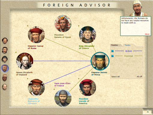 The trade screen shows that they have deals with England and Germany, and possible deals with France, Rome and Greece.