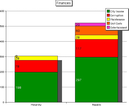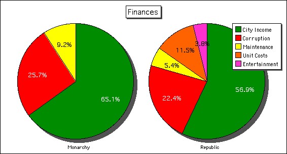 Conclusion: Corruption costs are, thankfully, no worse under Monarchy than under Republic. However as we will be making more money, we will also be losing more. If you calculate the percentage of income minus percentage of expenses, we currently make 30.2% surplus. Under Republic we can expect this to fall to 13.8%