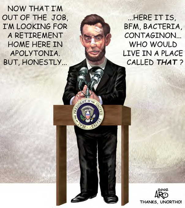 To the future: we have reached an enlightened time - we are now Republicans and I am proud to truly call myself a Democratically elected President under the Big Banana. We are faced with lagging behind in our scientific endeavours, and are challenged with finding ways of ensuring we remain the greatest nation on the planet. We are also faced with the aeons-old jungle still choking our lands. With a concerted effort, the hard-working Science Minister Thud and Works Supremo GhengisFarb, we can clear both these problems and reach our zenith, our perfection. City Overseer E_T has plans to make Apolytonia's cities into the most shining examples of cilvilization in history, and Imperial Expansion Minister Jonny will ensure virgin ( ) lands are taken for our burgeoning population.