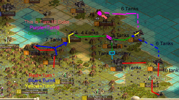 In response to the current poll indicating that England is the target of choice I have been instructed to update operation" Take out bad Elizabeth" or TOBE, with tanks in mind. Well here it is the plan for a 20 tank asault on England, there are variants of this that will bring in up to 40 tanks, the only difference is that actions designated later turns could take place sooner. The plan calls for all the southern tier or English cities to be taken in the first turn. At least 2 of these will be reduced using massed artillery to reduce the defenders to uselessness. We also have the option(not shown) of using massed calvary for some of the assaults. After the inital attack units will rest and artillery protected by infantry will begin the shelling of London. If we have more troops it is likely that there will be an amphibious assault on the english north at the canterbury point in the first turn. Currently this is a 10 turn plan requiring 20 tanks+40 artillery.