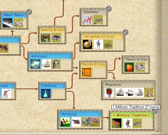 - We have started doing some serious research, and our ability to research isn't completely broken. The tech we are looking for (military tradition) will only take 11 turns total to be discovered. With such a fast research, we can hope to get to nationalism in 50-odd turns (didn't make the exact calcluations).