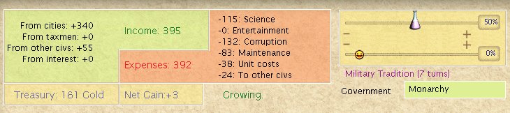 We have 161 gold, which is fewer than 5 turns ago, and we make 3 gpt, which is far fewer than 5 turns ago. The good side of things is that we are researching 4 times faster. And overall, our total income has increased, thanks to the gpt payments from abroad, and thanks to English wine (which eliminated the need of one to two entertainers per city, making these people actually productive).