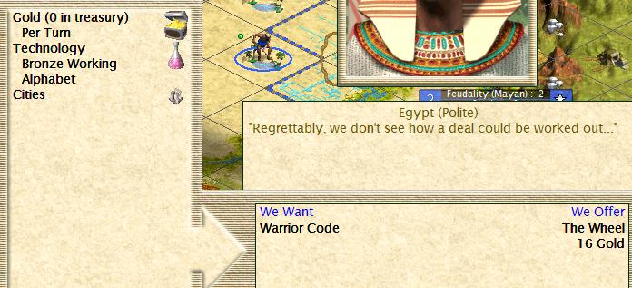 2510BC and we research a new tech -The Wheel! What's more, the only neighbour we have right now, Egypt, has not got this tech. They have Bronze Working, Alphabet and Warrior COde however. They refuse to accept even our offer of all our gold (16) and the Wheel for ANY of their techs! Oooh they think they're so much better than us...