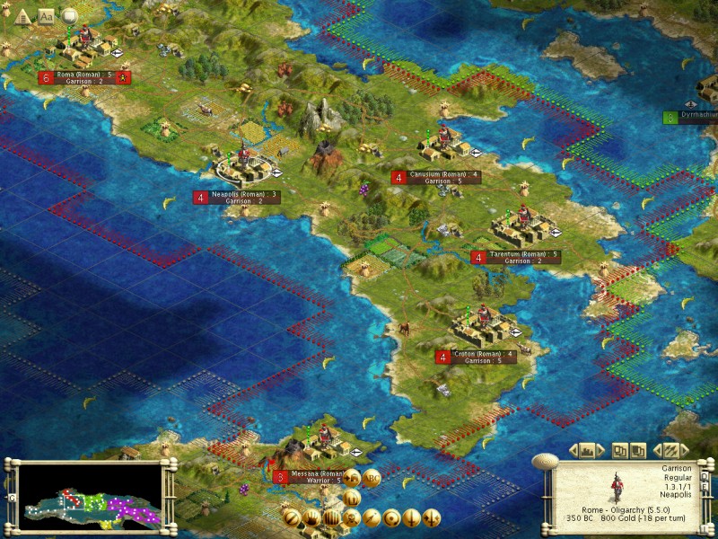 I'm attaching a view of the southern Empire. A city at Neapolis 333 owns the Irrigated Wheat tile, so it could provide us with Workers and then grow quickly. Plus it fits a CxxC pattern. The drawback - no free Aqueduct.