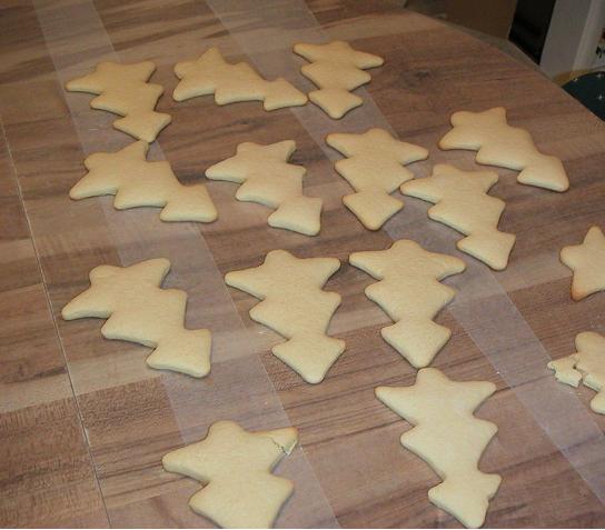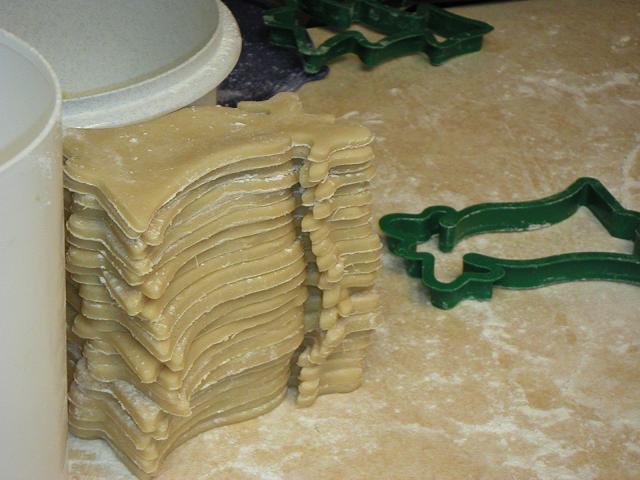 Roll flat and cut out your cookies. With a little dusting of the shapes, you can stack and store them as you work in a 3 pan rotatoin for mass baking, like I am doing.