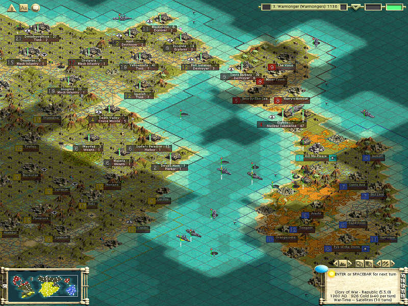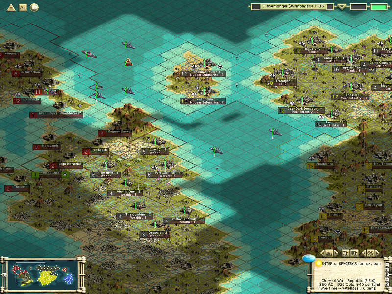 Also, I have sent UnOrthOdOx and our Cavalry corps in a brave mission. They will be sent to capture Inchon. Last turn our workers moved east of Elipolis where they will build a RR which will connect to the adjacent RRed tile. From there our 3-move units will ride by the eastern coast of GS while we nuke Inchon and leave it un-reinforcable by also bombing surrounding tiles.