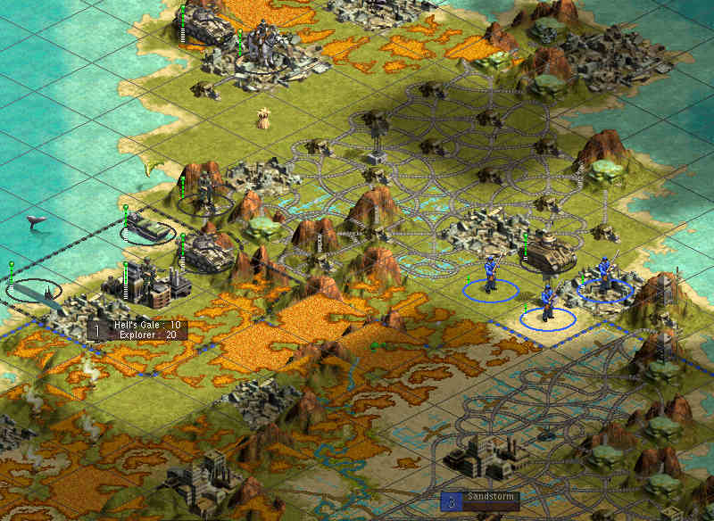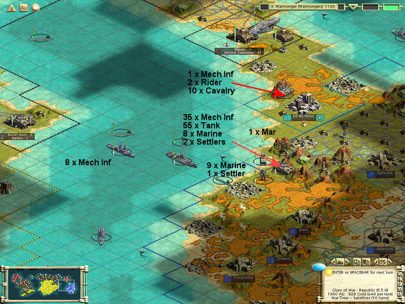 I'm going to post a pic of what our route of attack will be. Note from last turnthread's pics that I did not bomb the RRs and fortresses around our landing spot. Why? Because I WANT GS to attack us. We're sitting on a mountain tile with a fortress, which means our Mech Infs have a defense of 45. GS will get clobbered if they try and take out our stack.