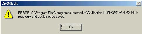 But if you really, really, really, really, really, really want to change civ3X.bix file, which I really, really, really, really, really advise not to do, only thing you need is to get to Civ3ptw folder, get civ3X.bix properties (right click) and then uncheck read-only attribute.