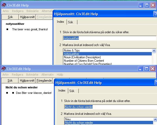 ) and one of the german Civ3Xedit.hlp file showing the translated name as "Nicht du schon wieder".Oh, and nevermind the Swedish interface