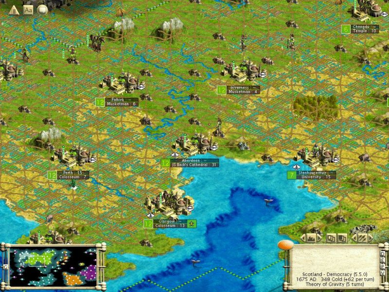 At the beginning of turn 2, two new mines around Aberdeen are completed. The two different worker groups converge in an irrigated tile between the two newly mined tiles, allowing a third tile to be mined by the end of turn 2. With the entertainer in Aberdeen put to work and three new mines the Wonder completion time has dropped to 31 turns even though in your save it would still have 39 turns to go.