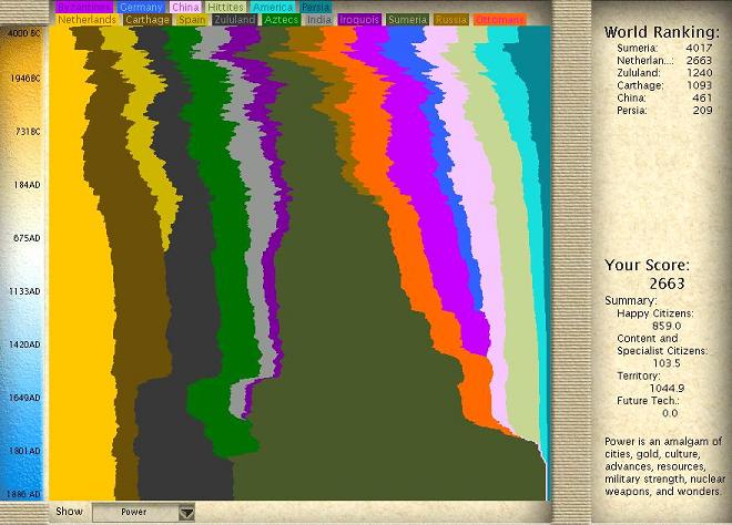 Just finished my first game as the Dutch, spaceship victory (by the skin of my teeth). Huge random map. Not a single SGL, didn't gain even the merest hint of a tech lead until early Industrial Age, and it was gone by the time the Modern Age arrived. Sumeria dominated virtually the entire game; I took great pains to keep peaceful relations, as I would've been overran in a heartbeat if I had picked a fight. Here's the victory status screen: