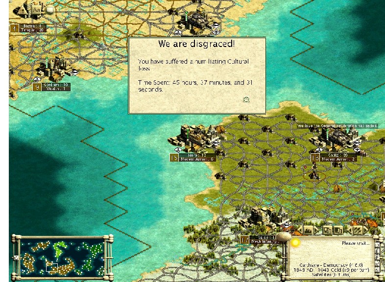 The most painful game I had was a Sid game that at around 1700AD I had gotten in tech parity and was doing well and got the same screen. You lose culture, it was hard to take.