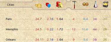The first column is food, in the form of consumed.stored. Paris generates a total of 31, consumes 24, and stores 7 each turn.