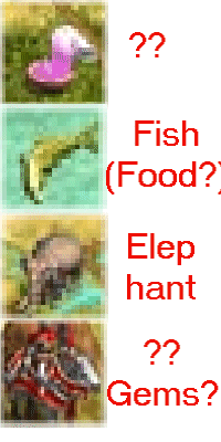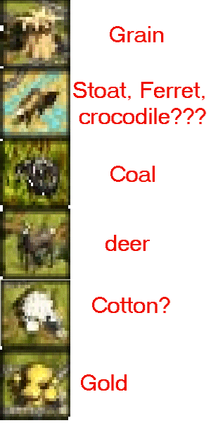 The first one I believe to be incense, and the last one a Knight And I name Elephant Ivory, as that name has been used in the game and it is confirmed that it is a luxury, and that Elephants don't need resources.