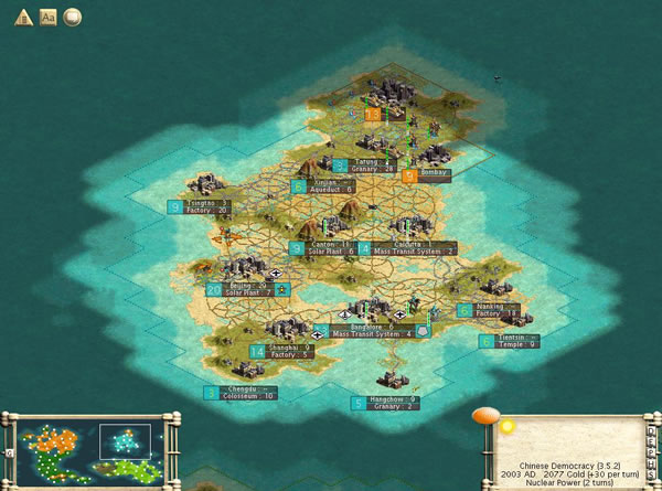 This thing was out of the Colin Powell play book: First, air assualts ripped up India's rails, bombing cities down as well, smacking any troops on the land. Then 5(!) tanks and supporting mounted riflemen (I think that was the troop) were dropped off on the SE side of the continent! They simply ROLLED over India's cities. No fewer than 3 aircraft carriers pulled in (there are under the battleships you see in the shot above) and began to pound Bombay! With bomb raining like hell-fire from English plane, support fire laid down from battleships, and tanks, artillery and machine gun infantry rolling over the land, the landscape of my little continent was changed forever.