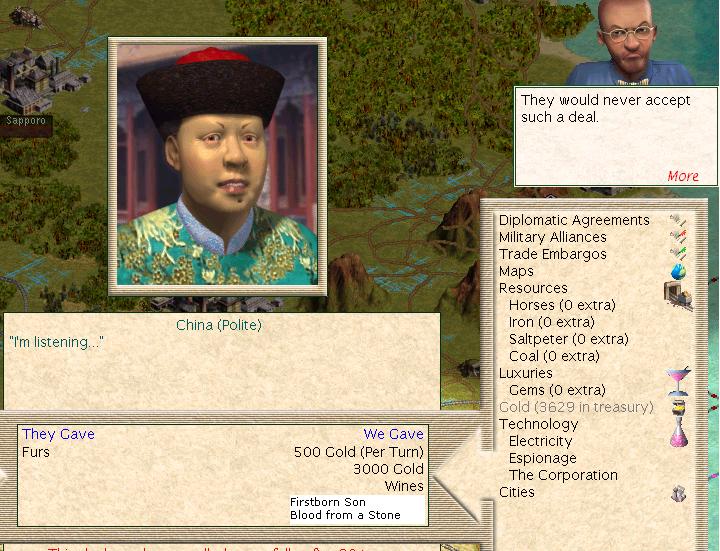 No - I added them to the grabs in Paint just to emphasize the point that I could not get Mao to trade - for reasons I cannot for the life of me explain - for anything. I guess I was so ahead of him techwise that he was not going to go for any money; he wanted techs or nothing at all.