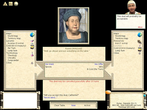 Below is a screen shot showing Catherine ready to accept a supply of Silks and 8 gpt for a supply of her Spices (I have obscured the minimap because I may share this game beginning with others, and don't want to spoil the game).