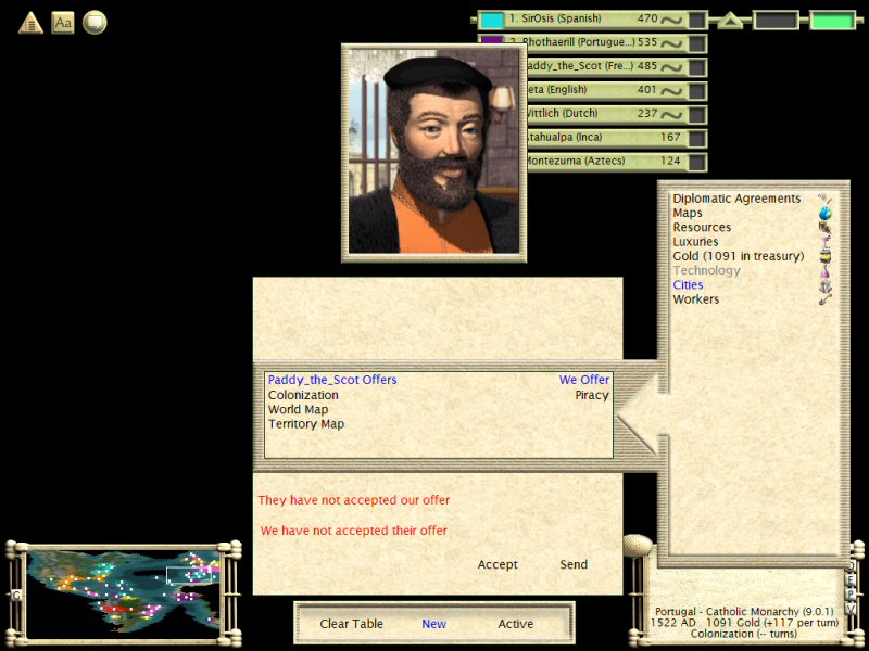 Now here is the crux of how I got my treasure units so quickly. My starting cities may not have been good at production, but they were great for commerce. I had the largest GNP for quite a while and used it to my advantage. I continued research apace with everyone else, which meant I regularly had +40gpt coming in. Later on after I researched piracy and was waiting for someone to finish colonization for trade purposes I was pulling in a lot of gold. By the time I did get the tech from Paddy I had plenty of gold to rush all the treasure producing city improvements in all of my cities, and then go full bore for mining and rush the gold and gem mines all within about 7 turns from the time I received the tech. Because none of my cities were excessively far away from my capital city it didn’t take very long to return treasure units. From my city in the Dominican Republic it takes three turns to get to my capital. With a transport roving around the Caribbean picking up treasure units and then transporting four of them at a time (protected by five frigates) over via a route through the ocean (which took about the same time as a sea lane and was safer from attack by the rest of you) it didn’t take much time to return a whole bunch of treasure.