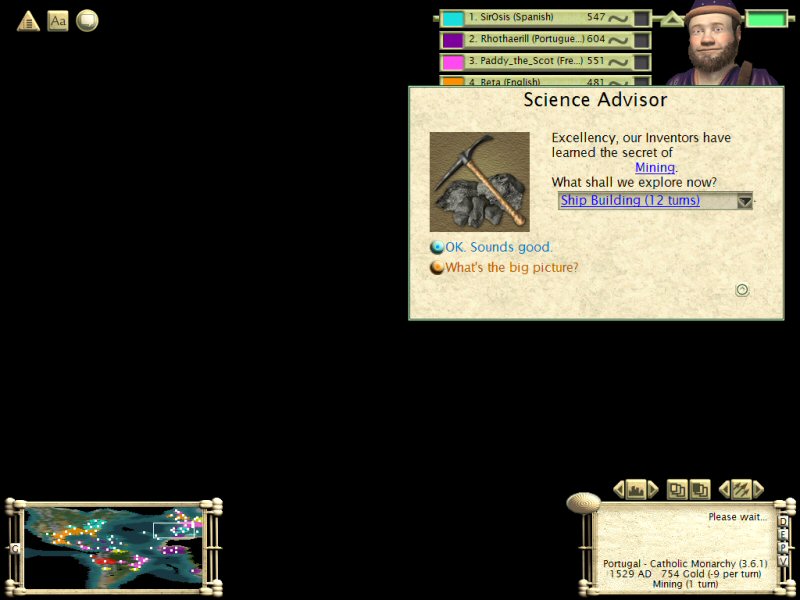 After mining, the only other tech I cared about was ship building so I researched slowly on that to continue to build a lot of gold which I used for hurrying scads of musketmen and more frigates….and all those pirate ships.