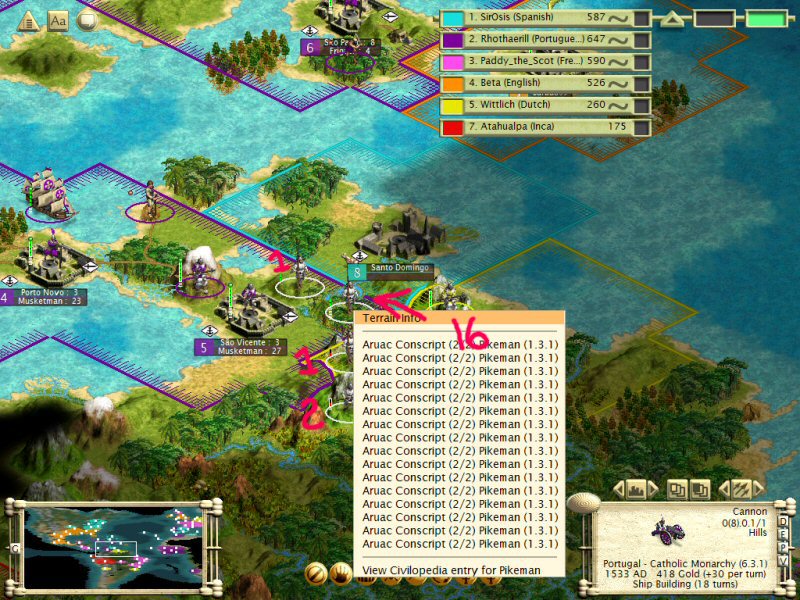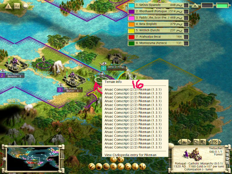 Treasure units weren’t the only reason I progressed so quickly in the victory point total though. I originally had absolutely no intention of getting into a war. I wanted a completely defensive and naval military. I watched while Beta and Paddy were effecting the extermination of the natives and gaining their territory, all the while building up my defense forces for what I assumed would be the inevitable attack on me once everyone realized how far ahead I was. Then the barbarians intervened.